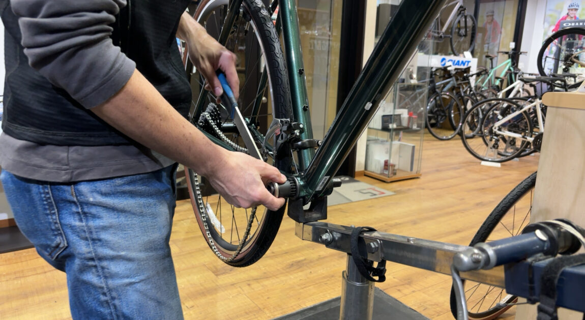 写真はクランクを外しBBを一度緩めてから再度増し締めをしている様子です!