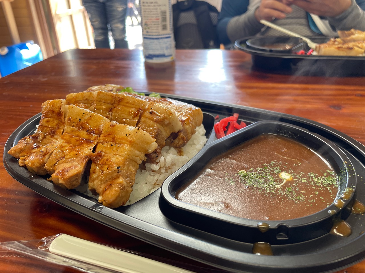 山の家では名物の漢気カレーと源喜亭の豚の蒲焼きがコラボしたカレーも販売されており、カップラーメンと絶品のカレーも味わってこれました!